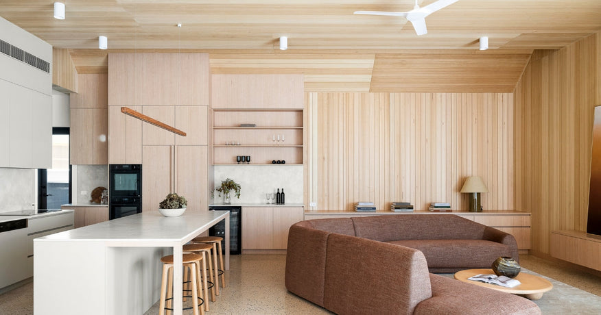 A highlight of the architecture is the extensive use of decorative timber panelling, which softens each space and introduces a crafted warmth throughout the home. Rather than puncture these surfaces with excessive downlights, About Space took a low-impact, sustainability-focused approach.