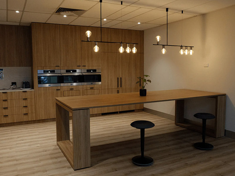 Our Australian-made commercial linear lights are assembled at our head office in Fitzroy, and can be made to your exact specifications. Whether you’re looking to customise linear lighting from our existing collection or after a one-of-a-kind piece, all of our commercial linear pendant lights can be customised in shape, length and material.